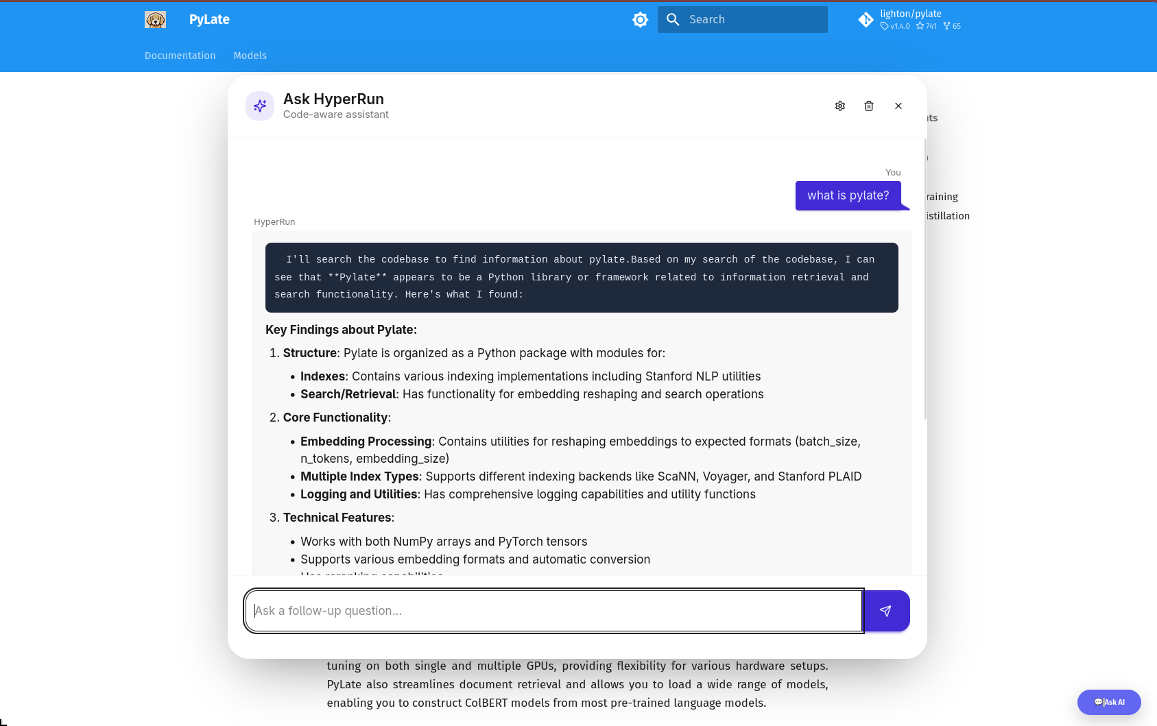 HyperRun lets developers add a semantic code search chat widget to their docs.